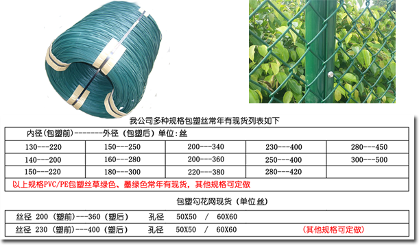 公司经营包塑丝系列:包塑丝、涂塑丝、包胶丝、PVC包塑丝、PE包塑丝、电镀锌铁丝扎线。常用规格公司常年均有现货,其他规格可加工定做